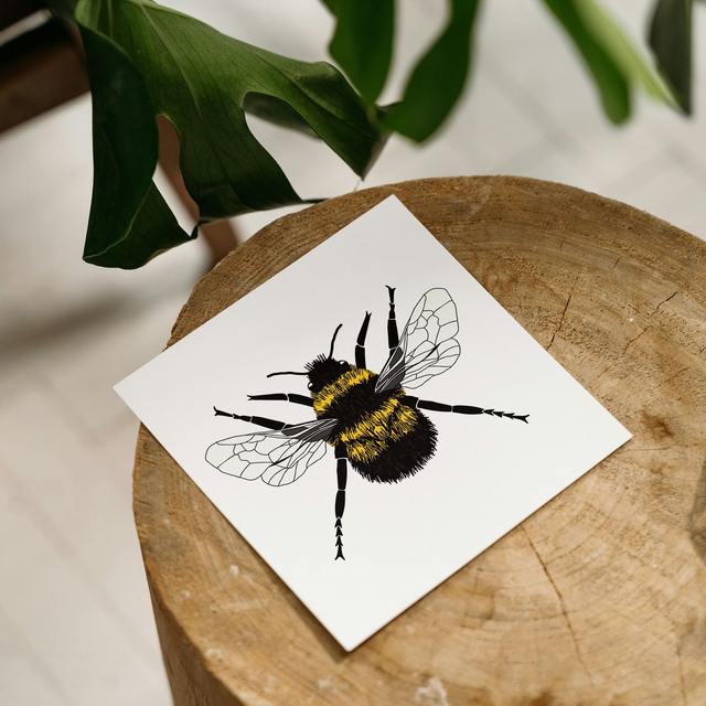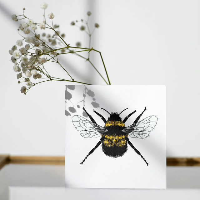This greeting card features my graphic illustration of a bumblebee. It has no message and is blank inside so can be used for a variety of occasions.