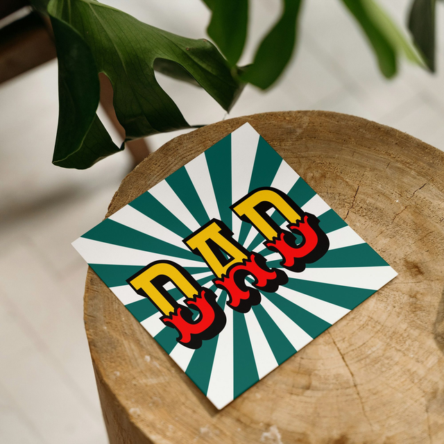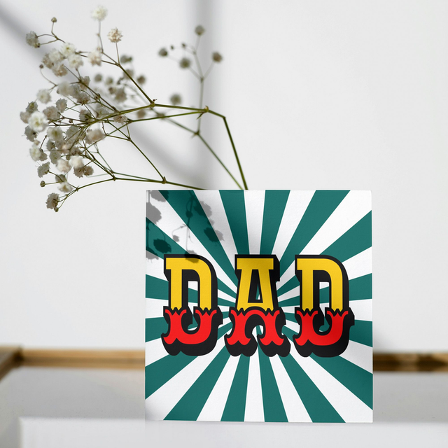 This greeting card features my graphic illustration of circus font on a green and white pinwheel background. It has the message 'Dad' and can be used for various occasions.