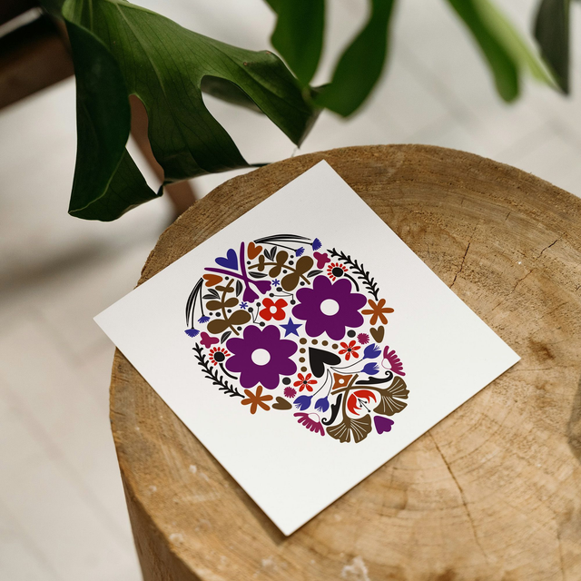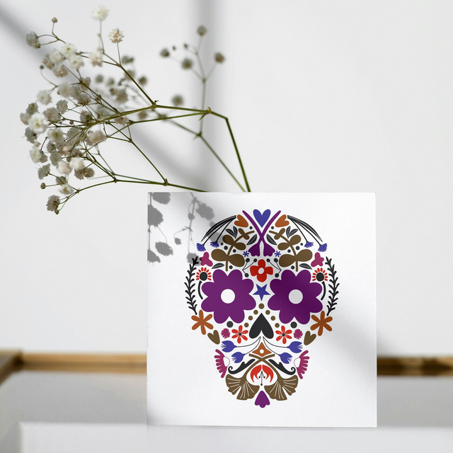 This greeting card features my graphic illustration of a floral skull, inspired by the Mexican 'Day of the Dead'. It has no message and is blank inside so can be used for a variety of occasions.