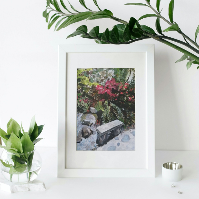 This print features my acrylic painting of the Japanese Garden in Calderstones Park, Liverpool.