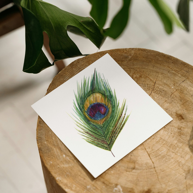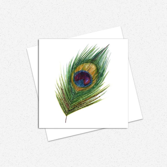 This greeting card features my watercolour painting of a peacock feather. It has no message and is blank inside so can be used for a variety of occasions.