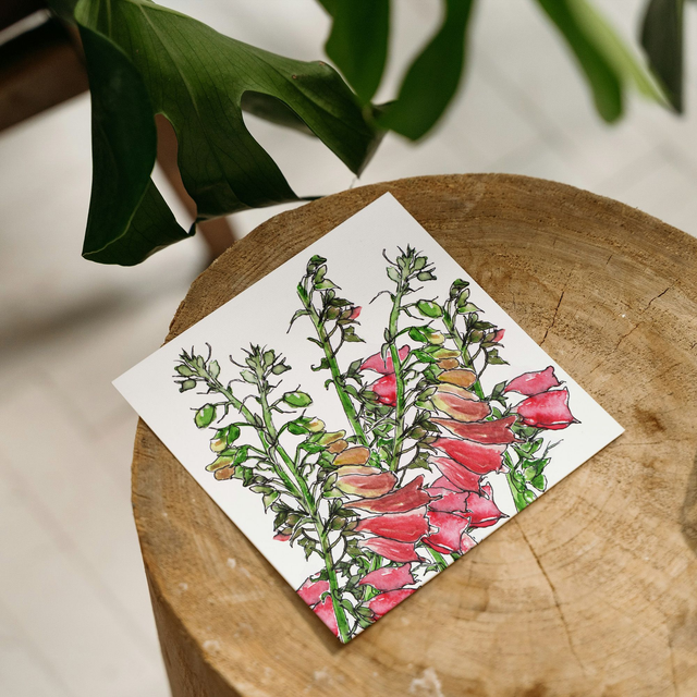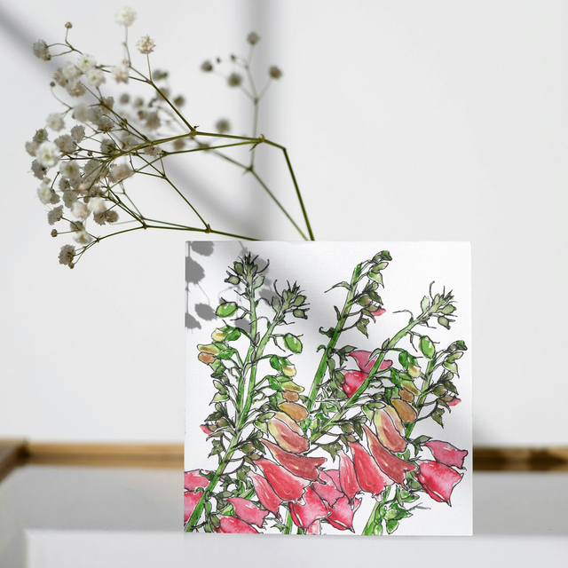This greeting card features my ink and watercolour painting of wild foxgloves. It has no message and is blank inside so can be used for a variety of occasions.
